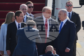President Donald Trump, center talks with Israel's Prime Minister Benjamin Netanyahu as he arrives at Ben Gurion Airport near Tel Aviv, Israel, Monday, Oct. 13, 2025. (AP Photo/Ariel Schalit)