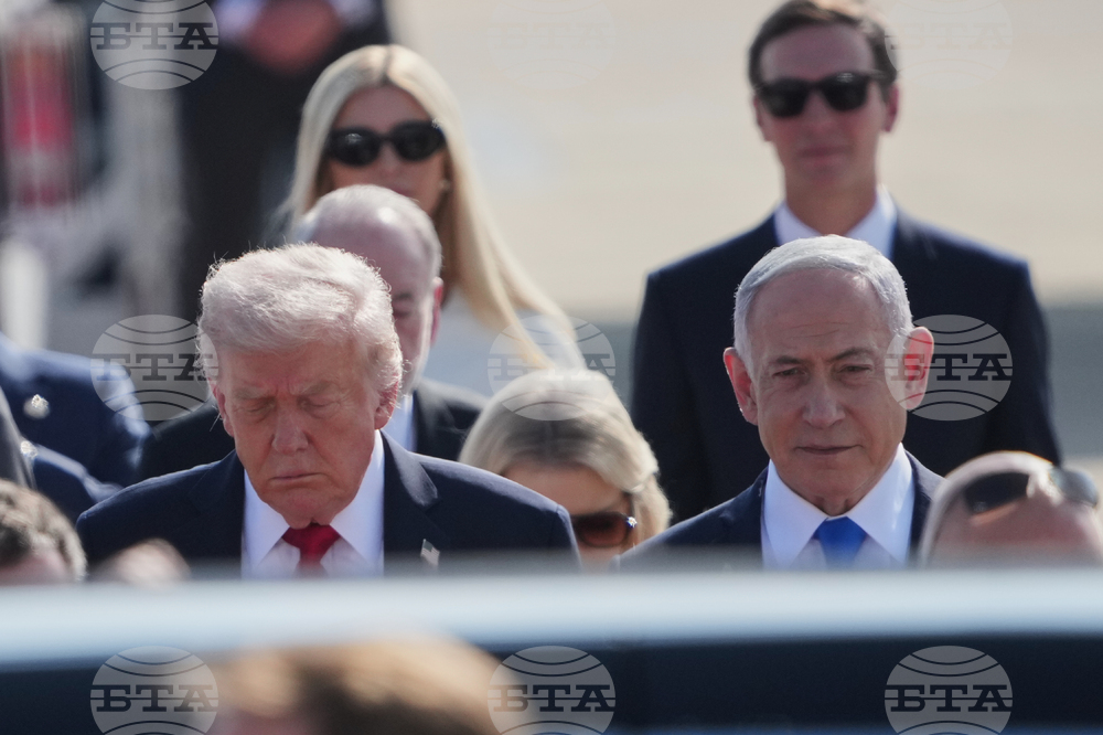 President Donald Trump, center, walks with Israel's Prime Minister Benjamin Netanyahu as he arrives at Ben Gurion Airport near Tel Aviv, Israel, Monday, Oct. 13, 2025. (AP Photo/Ariel Schalit)