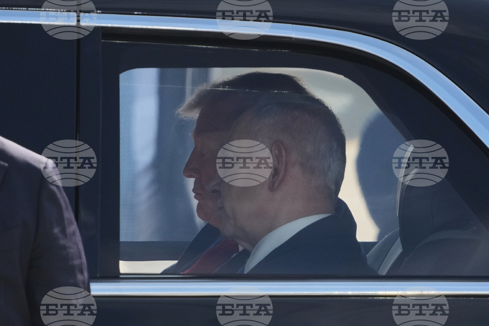 President Donald Trump and Israeli Prime Minister Benjamin Netanyahu sit together in a car after a welcoming ceremony at Ben Gurion Airport near Tel Aviv, Israel, Monday, Oct. 13, 2025. (AP Photo/Ariel Schalit)