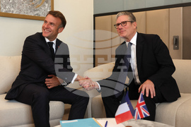Britain's Prime Minister Keir Starmer, right, and French President Emmanuel Macron shake hands before attending a world leaders' summit on ending the Gaza war, in Sharm el-Sheikh, Egypt, Monday, Oct. 13, 2025. (Suzanne Plunkett/Pool Photo via AP)