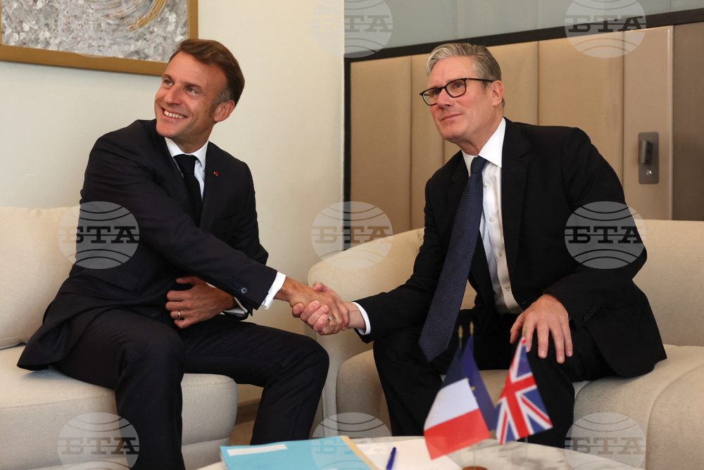 Britain's Prime Minister Keir Starmer, left, and French President Emmanuel Macron, before attending a world leaders' summit on ending the Gaza war, in Sharm el-Sheikh, Egypt, Monday, Oct. 13, 2025. (Suzanne Plunkett/Pool Photo via AP)