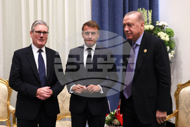 British Prime Minister Keir Starmer, left, Turkey's President Recep Tayyip Erdogan, right, and French President Emmanuel Macron meet before attending a world leaders' summit on ending the Gaza war, in Sharm el-Sheikh, Egypt, Monday, Oct. 13, 2025. (Suzanne Plunkett, Pool Photo via AP)