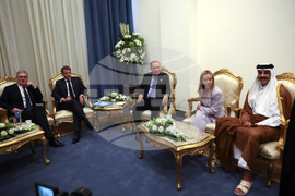 From left, Turkey's President Recep Tayyip Erdogan, Italy's Prime Minister Giorgia Meloni and Emir of Qatar Sheikh Tamim ibn Hamad Al Thani meet before attending a world leaders' summit on ending the Gaza war, in Sharm el-Sheikh, Egypt, Monday, Oct. 13, 2025. (Suzanne Plunkett, Pool Photo via AP)