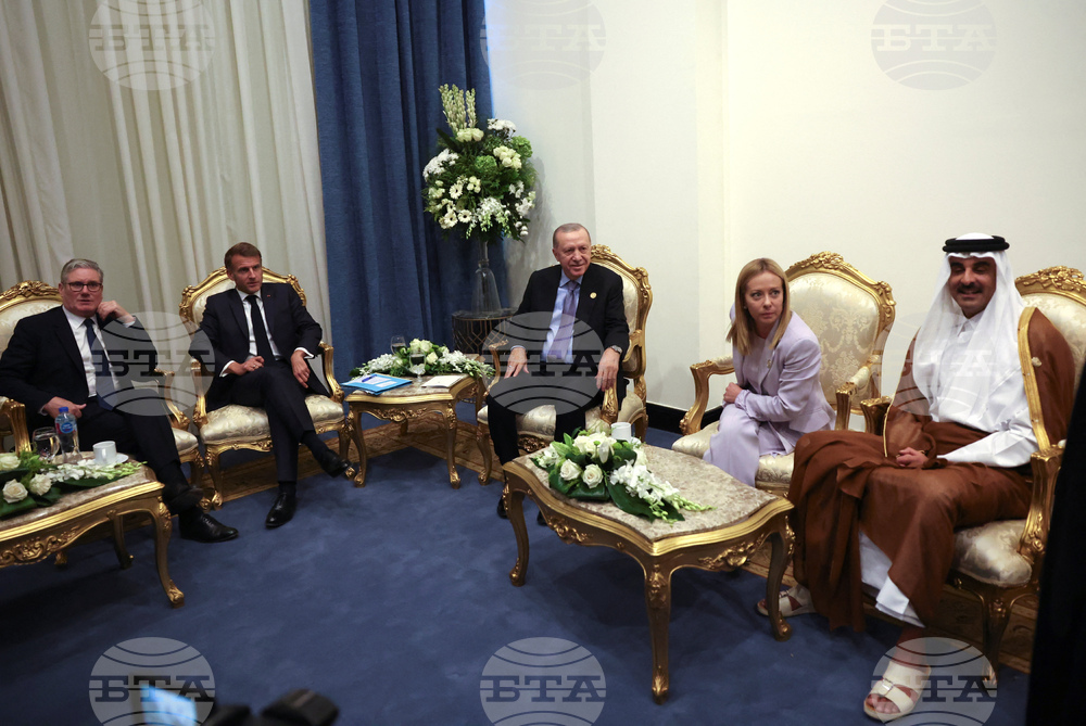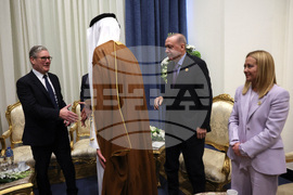 From left, British Prime Minister Keir Starmer, French President Emmanuel Macron, Turkey's President Recep Tayyip Erdogan, Italy's Prime Minister Giorgia Meloni and Emir of Qatar Sheikh Tamim ibn Hamad Al Thani meet before attending a world leaders' summit on ending the Gaza war, in Sharm el-Sheikh, Egypt, Monday, Oct. 13, 2025. (Suzanne Plunkett, Pool Photo via AP)