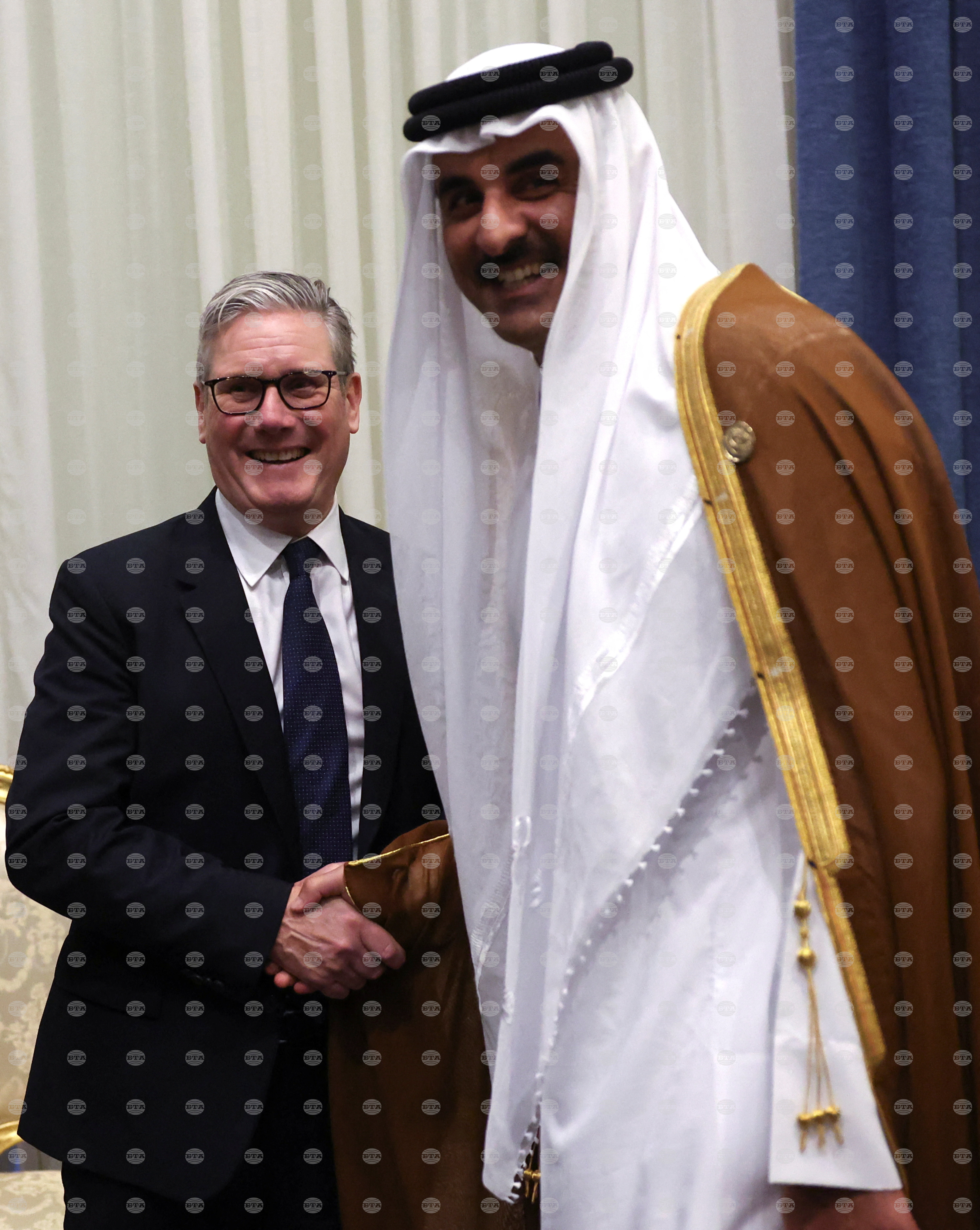 British Prime Minister Keir Starmer, left, and Emir of Qatar Sheikh Tamim ibn Hamad Al Thani shake hands as they meet before attending a world leaders' summit on ending the Gaza war, in Sharm el-Sheikh, Egypt, Monday, Oct. 13, 2025. (Suzanne Plunkett, Pool Photo via AP)