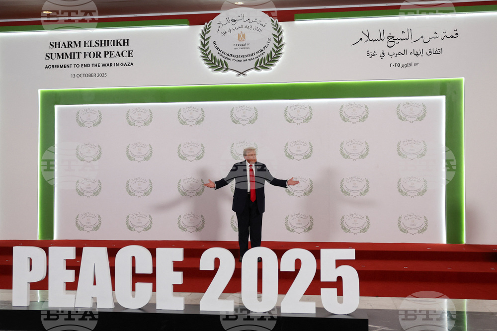 President Donald Trump gestures as he poses next to a sign before a family photo at a world leaders' summit on ending the Gaza war, in Sharm el-Sheikh, Egypt, Monday, Oct. 13, 2025. (Suzanne Plunkett, Pool Photo via AP)