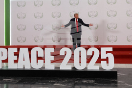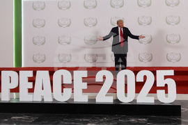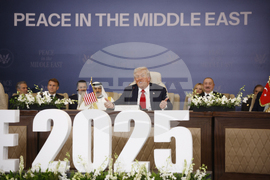 President Donald Trump attends the signature ceremony at the Gaza International Peace Summit, in Sharm el-Sheikh, Egypt, Monday, Oct.13 2025. (Yoan Valat, Pool photo via AP)