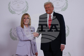 President Donald Trump and Italian Prime Minister Giorgia Meloni, left, shake hands as they pose for a photo in Sharm el-Sheikh, Egypt, Monday, Oct. 13, 2025. (Suzanne Plunkett, Pool Photo via AP)