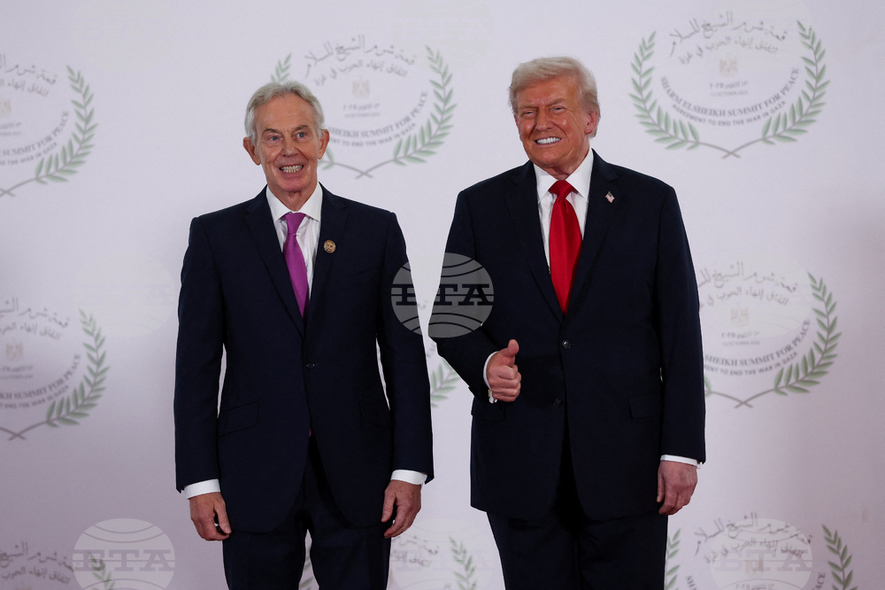 President Donald Trump and Britain's former Prime Minister Tony Blair pose for a photo in Sharm el-Sheikh, Egypt, Monday, Oct. 13, 2025. (Suzanne Plunkett, Pool Photo via AP)