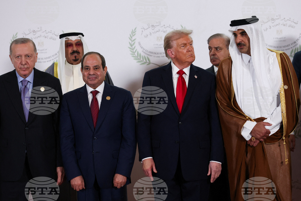 From the left, Turkish President Recep Tayyip Erdogan, Egyptian President Abdel Fattah al-Sisi, US President Donald Trump, Emir of Qatar Cheikh Tamim ben Hamad al-Thani, and King Abdullah II of Jordan, pose during the family picture at the Gaza International Peace Summit, in Sharm el-Sheikh, Egypt, Monday, Oct.13 2025. (Yoan Valat, Pool photo via AP)