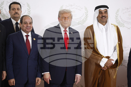 President Donald Trump and Emir of Qatar Cheikh Tamim ben Hamad al-Thani attend the family picture at the Gaza International Peace Summit, in Sharm el-Sheikh, Egypt, Monday, Oct.13 2025. (Yoan Valat, Pool photo via AP)