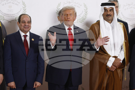 Egyptian President Abdel Fattah al-Sisi, US President Donald Trump, and Emir of Qatar Sheikh Tamim bin Hamad al-Thani pose during the family picture at the Gaza International Peace Summit, in Sharm el-Sheikh, Egypt, Monday, Oct.13 2025. (Yoan Valat, Pool photo via AP)
