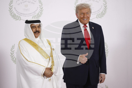 President Donald Trump and Bahrain's King Hamad bin Isa Al Khalifa pose during the family picture at the Gaza International Peace Summit, in Sharm el-Sheikh, Egypt, Monday, Oct.13 2025. (Yoan Valat, Pool photo via AP)