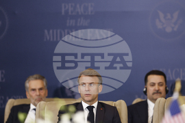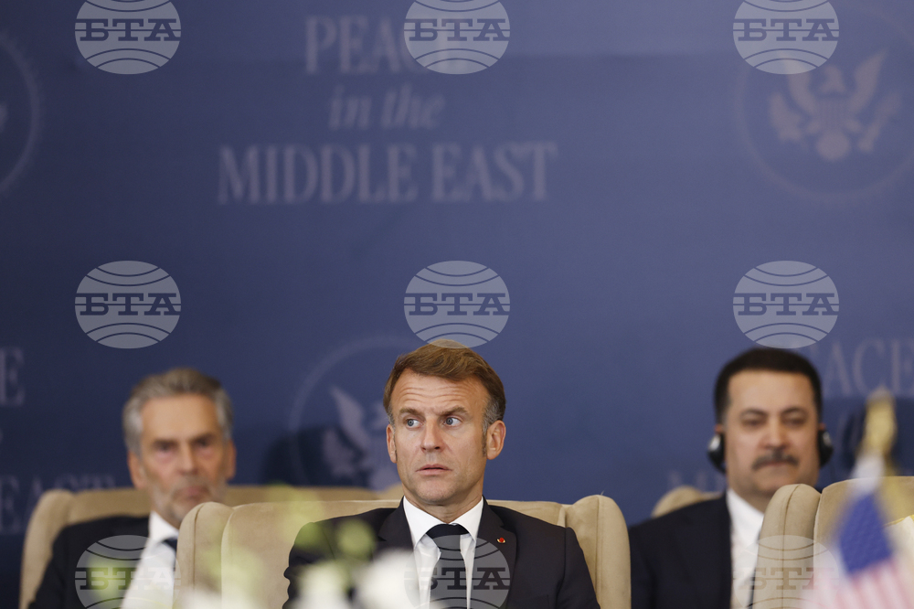 French President Emmanuel Macron looks on during the signature ceremony at the Gaza International Peace Summit, in Sharm el-Sheikh, Egypt, Monday, Oct.13 2025. (Yoan Valat, Pool photo via AP)