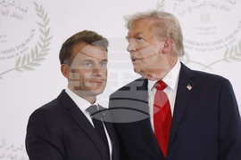 President Donald Trump talks to French President Emmanuel Macron during the greetings ceremony before the family picture at the Gaza International Peace Summit, in Sharm el-Sheikh, Egypt, Monday, Oct.13 2025. (Yoan Valat, Pool photo via AP)