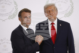 President Donald Trump and French President Emmanuel Macron shake hands during the greetings ceremony before the family picture at the Gaza International Peace Summit, in Sharm el-Sheikh, Egypt, Monday, Oct.13 2025. (Yoan Valat, Pool photo via AP)