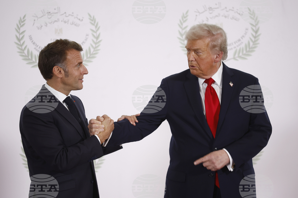 President Donald Trump and French President Emmanuel Macron, left, shake hands as they pose for a photo in Sharm el-Sheikh, Egypt, Monday, Oct. 13, 2025. (Suzanne Plunkett, Pool Photo via AP)