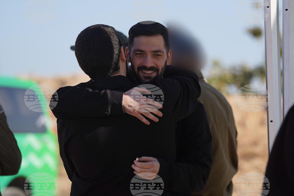In this photo provided by the Israeli Defense Forces, Ziv Berman speaks with IDF representatives after released from Hamas, in Israel on Monday, Oct. 13, 2025. (IDF via AP)