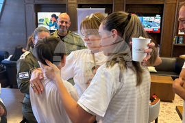 In this photo provided by the Israeli Defense Forces, Omri Miran hugs his wife Lishay Miran-Lavi after released from Hamas, in Israel on Monday, Oct. 13, 2025. (IDF via AP)