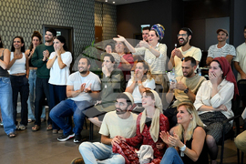 The families of Evyatar David and Avinatan Or watching their transfer at the initial reception point after being released from Hamas, in Israel on Monday, Oct. 13, 2025. (IDF via AP)