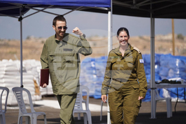 In this photo provided by the Israeli Defense Forces, Guy Gilboa-Dalal speaks with an IDF representative in Israel on Monday, Oct. 13, 2025. (IDF via AP)