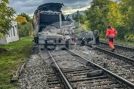 In this photo released by Slovak Police, rescue workers at the site of a train crash near Roznava, Slovakia, Monday, Oct. 13, 2025. (Slovak Police via AP)