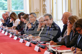 France's reappointed Prime Minister Sebastien Lecornu walks past a meeting table as he welcomes the newly-appointed members of his cabinet in Paris, Monday, Oct. 13, 2025. (Alain Jocard, Pool photo via AP)