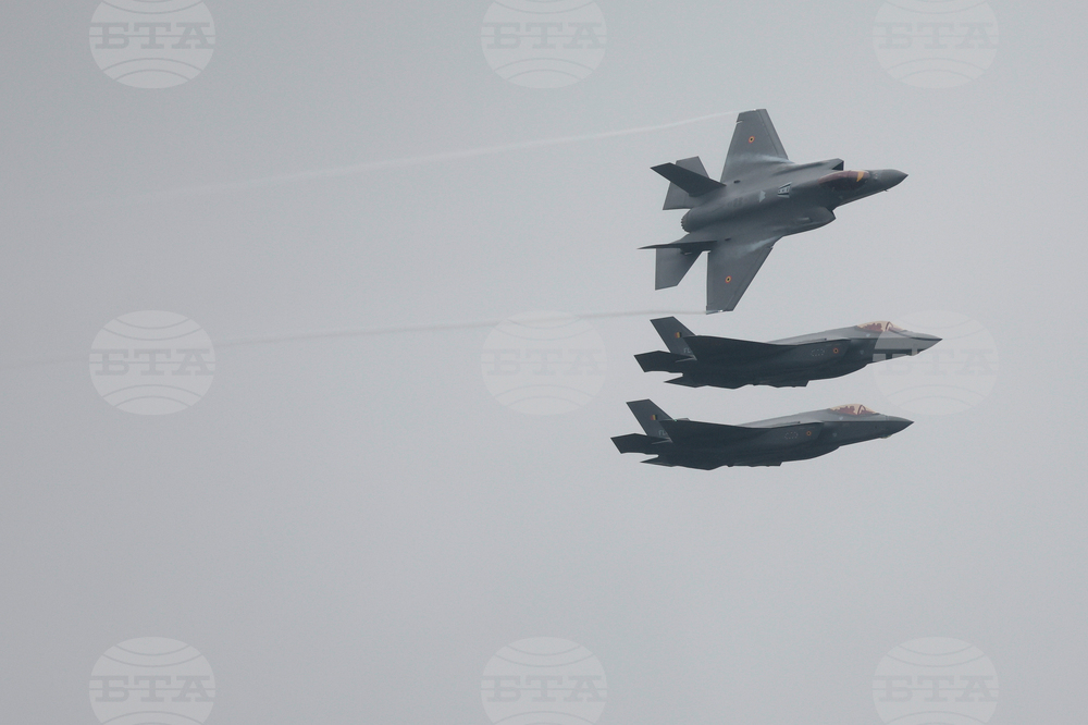 An F-35A Lightning II flys by on the occassion of the first F-35 fighter jets arriving at the Florennes Airbase in Florennes, Belgium, Monday, Oct. 13, 2025 (AP Photo/Geert Vanden Wijngaert)