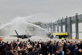 An F-35A Lightning II is sprayed with water on the occasion of the first F-35 fighter jets arriving at the Florennes Airbase in Florennes, Belgium, Monday, Oct. 13, 2025 (AP Photo/Geert Vanden Wijngaert)
