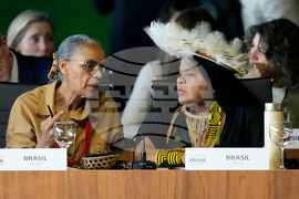 Brazilian Environment Minister Marina Silva, left, talks with Brazilian Indigenous Peoples Minister Sonia Guajajara at the opening ceremony of the Pre-COP30 meeting in Brasilia, Brazil, Monday, Oct. 13, 2025, during the final preparatory stage for the U.N. Climate Summit which will take place in November in Belem. (AP Photo/Eraldo Peres)