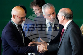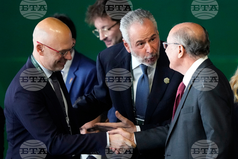 UNFCCC Executive Secretary Simon Stiell, left, COP30 President-Designate Andre Correa, center, and Brazilian Vice President Geraldo Alckmin attend the opening ceremony of the Pre-COP30 meeting in Brasilia, Brazil, Monday, Oct. 13, 2025, as part of final preparatory stage for the U.N. Climate Summit in November. (AP Photo/Eraldo Peres)