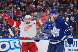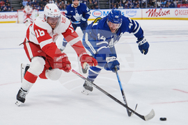Detroit Red Wings' Andrew Copp (18) battles for the puck with Toronto Maple Leafs' Morgan Rielly (44) during first period NHL hockey action in Toronto, Monday, Oct. 13, 2025. (Sammy Kogan/The Canadian Press via AP)