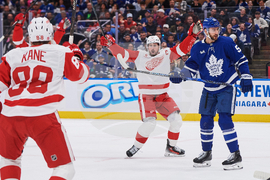 Detroit Red Wings' James van Riemsdyk (21) celebrates after his goal with teammates during third-period NHL hockey game action against the Toronto Maple Leafs in Toronto, Monday, Oct. 13, 2025. (Sammy Kogan/The Canadian Press via AP)