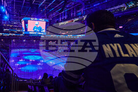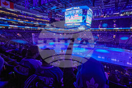 Toronto Maple Leafs fans cheer for the Toronto Blue Jays as the ALCS baseball Game 2 against the Seattle Mariners is displayed on the videoboard at Scotiabank Arena after an NHL hockey game between the Maple Leafs and the Detroit Red Wings in Toronto, Monday, Oct. 13, 2025. (Sammy Kogan/The Canadian Press via AP)