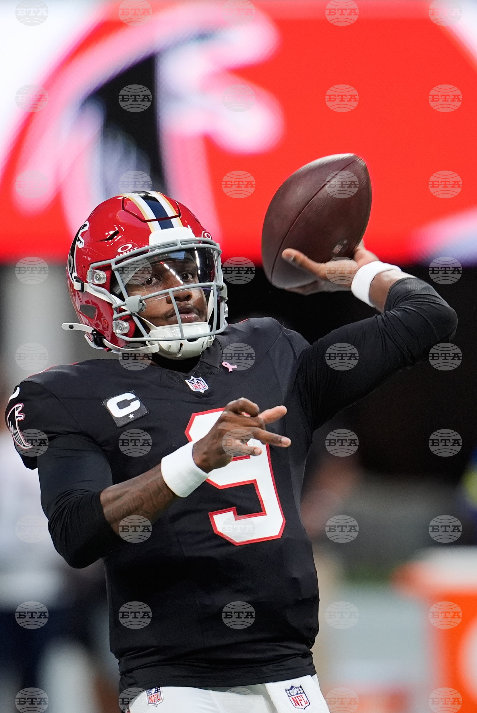 Atlanta Falcons quarterback Michael Penix Jr. (9) warms up before an NFL football game against the Buffalo Bills, Monday, Oct. 13, 2025, in Atlanta. (AP Photo/Mike Stewart)