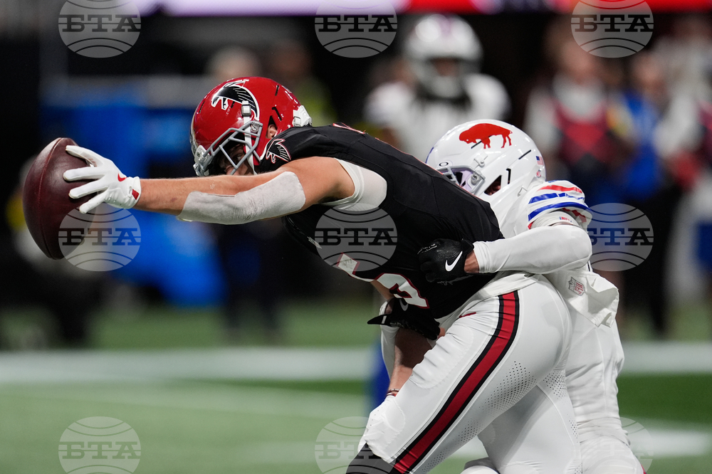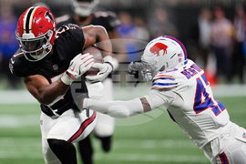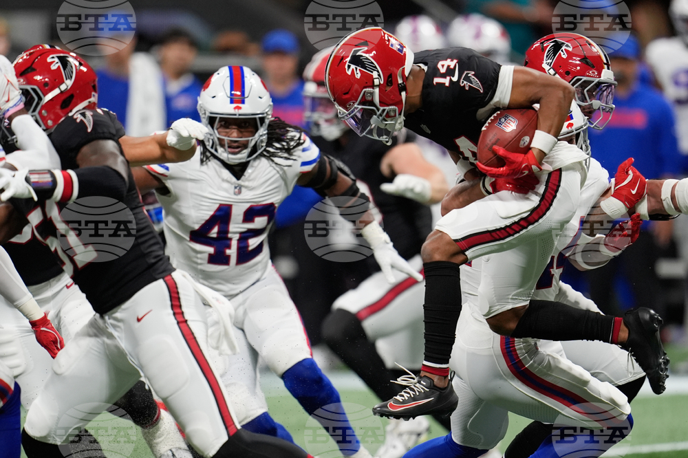 Atlanta Falcons running back Tyler Allgeier (25) carries during the second half of an NFL football game against the Buffalo Bills, Monday, Oct. 13, 2025, in Atlanta. (AP Photo/Mike Stewart)
