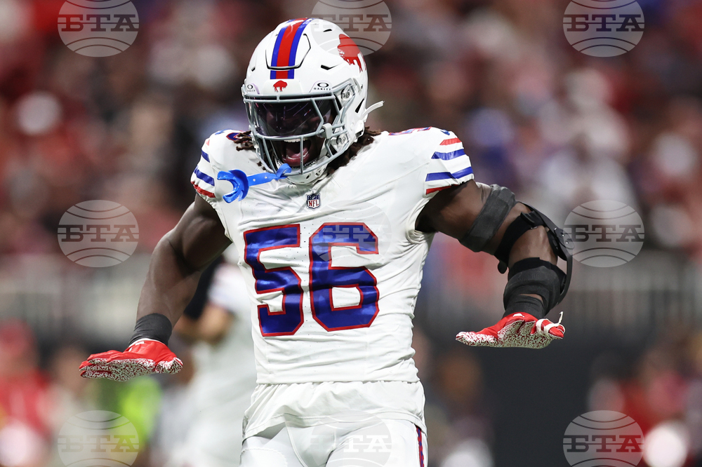 Buffalo Bills defensive end Javon Solomon (56) celebrates after sacking Atlanta Falcons quarterback Michael Penix Jr. (9) during the first half of an NFL football game, Monday, Oct. 13, 2025, in Atlanta. (AP Photo/Colin Hubbard)