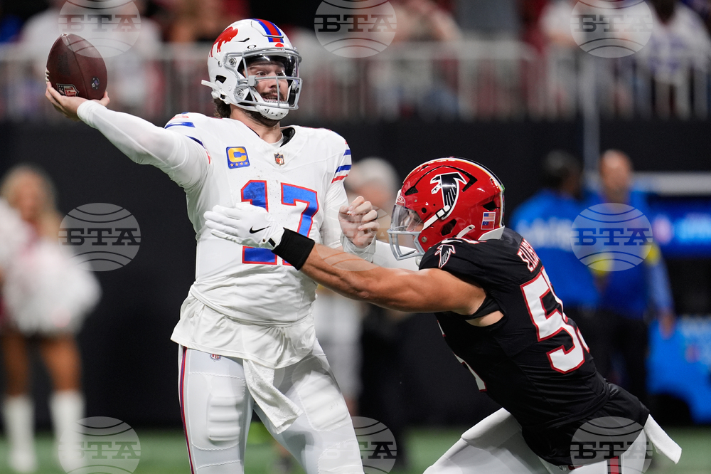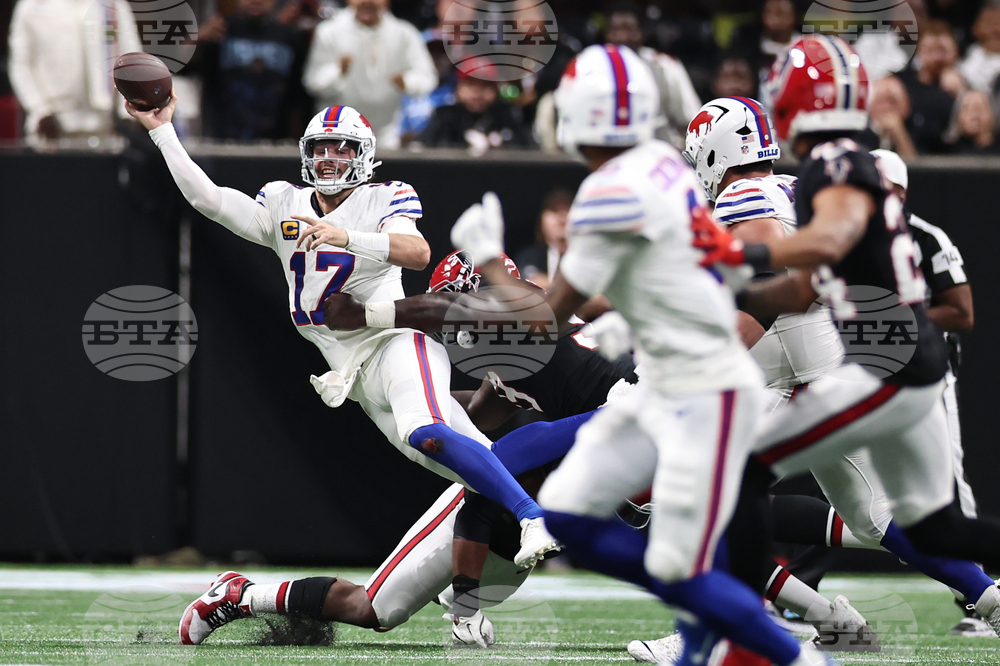 Buffalo Bills quarterback Josh Allen (17) throws a pass during the first half of an NFL football game against the Atlanta Falcons, Monday, Oct. 13, 2025, in Atlanta. (AP Photo/Mike Stewart)