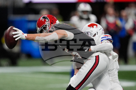 Buffalo Bills tight end Dawson Knox (88) kneels in the end zone with a touchdown catch during the first half of an NFL football game against the Atlanta Falcons, Monday, Oct. 13, 2025, in Atlanta. (AP Photo/Mike Stewart)