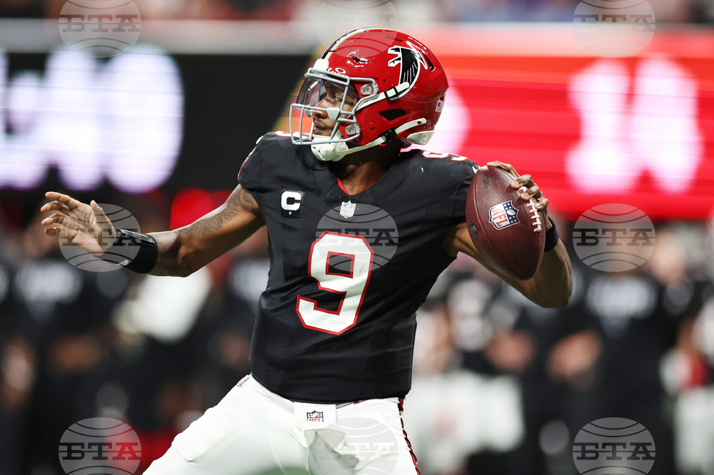 Atlanta Falcons quarterback Michael Penix Jr. (9) throws a pass during the first half of an NFL football game against the Buffalo Bills, Monday, Oct. 13, 2025, in Atlanta. (AP Photo/Mike Stewart)