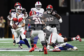 Buffalo Bills wide receiver Khalil Shakir (10) is tackled by Atlanta Falcons cornerback Dee Alford during the first half of an NFL football game, Monday, Oct. 13, 2025, in Atlanta. (AP Photo/Mike Stewart)
