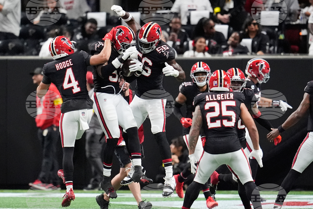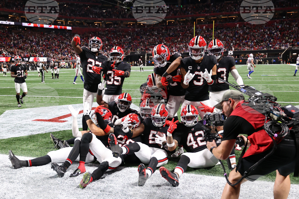 The Atlanta Falcons celebrate after an interception during the second half of an NFL football game against the Buffalo Bills, Monday, Oct. 13, 2025, in Atlanta. (AP Photo/Colin Hubbard)