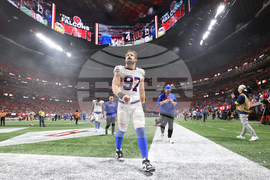 Buffalo Bills defensive end Joey Bosa (97) walks off the field after a loss to the Atlanta Falcons in an NFL football game, Monday, Oct. 13, 2025, in Atlanta. (AP Photo/Colin Hubbard)
