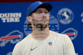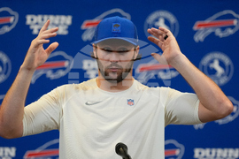Buffalo Bills quarterback Josh Allen speaks during a news conference after an NFL football game between the Atlanta Falcons and the Buffalo Bills, Monday, Oct. 13, 2025, in Atlanta. (AP Photo/Mike Stewart)