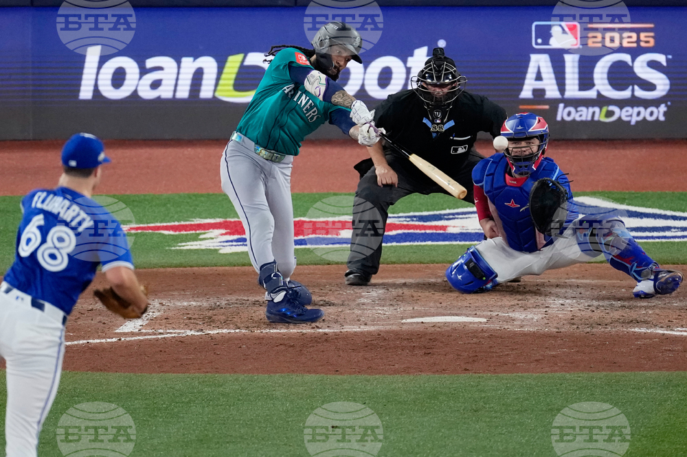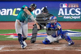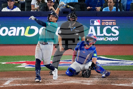 Seattle Mariners second baseman Jorge Polanco hits a two-run home run during the fifth inning of baseball's American League Division Series in Toronto, Monday, Oct. 13, 2025. (Nathan Denette//The Canadian Press via AP)