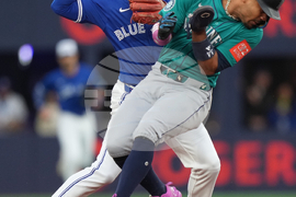 Toronto Blue Jays shortstop Andrés Giménez, left, forces out Seattle Mariners' Julio Rodríguez, right, during the third inning of Game 2 of baseball's American League Division Series in Toronto, Monday, Oct. 13, 2025. (Frank Gunn/The Canadian Press via AP)Nathan Denette/The Canadian Press via AP)