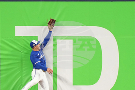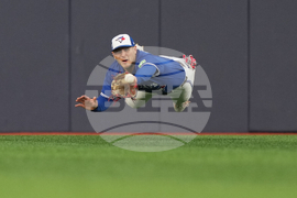Seattle Mariners outfielder Victor Robles makes a catch in the outfield during the third inning of Game 2 of baseball's American League Division Series against the Toronto Blue Jays in Toronto, Monday, Oct. 13, 2025. (Nathan Denette/The Canadian Press via AP)