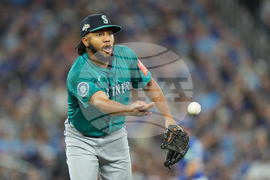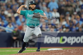 Seattle Mariners pitcher Logan Gilbert (36) works against the Toronto Blue Jays during the first inning of Game 2 of baseball's American League Division Series in Toronto, Monday, Oct. 13, 2025. (Nathan Denette/The Canadian Press via AP)