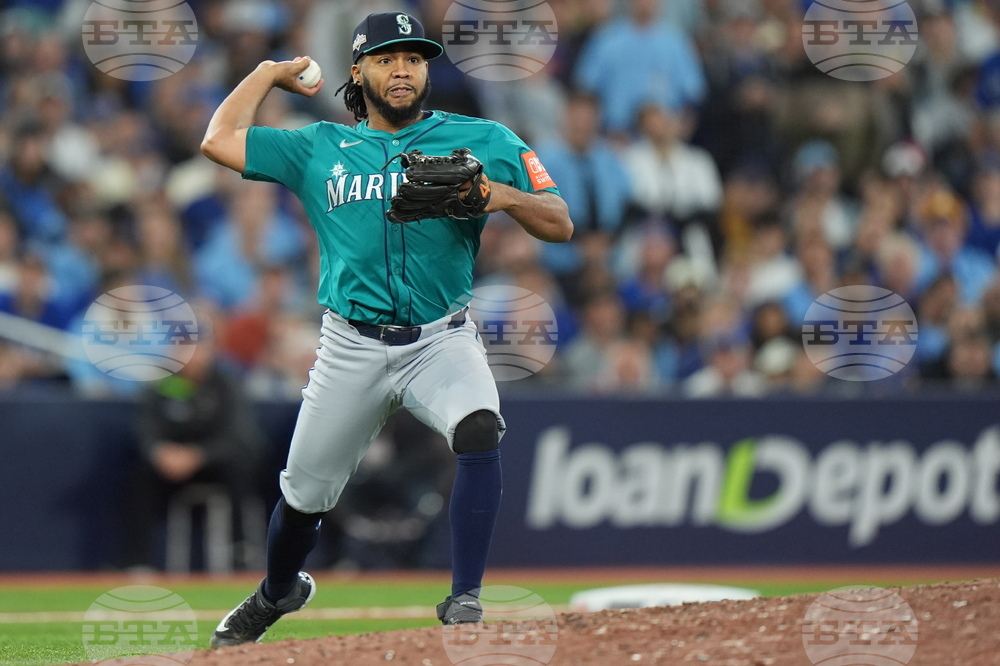 Seattle Mariners pitcher Carlos Vargas throws during the sixth inning of Game 2 of baseball's American League Division Series against the Toronto Blue Jays in Toronto, Monday, Oct. 13, 2025. (Frank Gunn/The Canadian Press via AP)