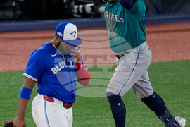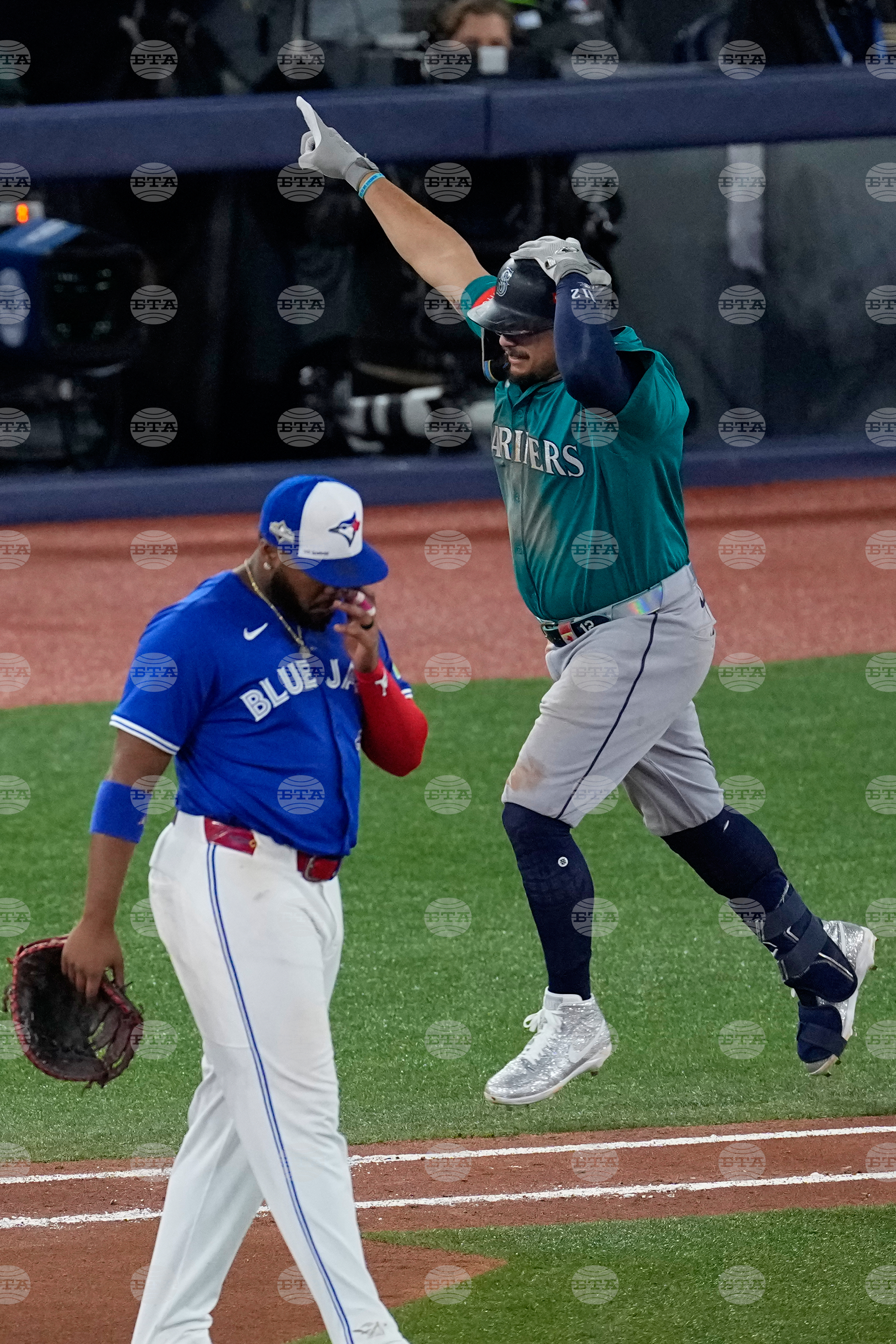 Seattle Mariners Josh Naylor, right, celebrates after hitting a two run home run as Toronto Blue Jays Vladimir Guerrero Jr. looks away during the seventh inning in Game 2 of baseball's American League Championship Series, Monday, Oct. 13, 2025, in Toronto. (AP Photo/David J. Phillip)